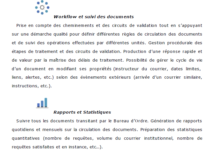 Les fonctionnalités de la solution GED : Gestion de courriers, recherche et visualisation de l’information, tracabilité et gestion des versions d’un document,workflow et suivi des documents,rapports et statistiques.